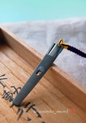 茎キーホルダーではシルエットの特徴にとどまらず、立体として楽しめるように三つ棟・小肉棟も再現。はばき下には個性的な彫刻の“止め”も部分もトリミング。